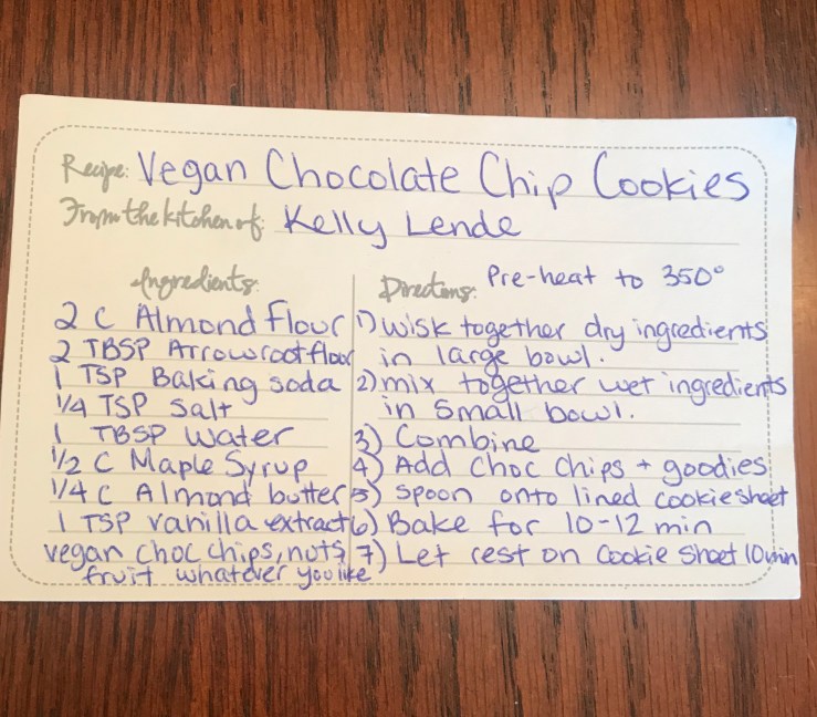 -Chocolate Chip Cookes: I got my friend Kelly’s permission to post her amazing chocolate chip cookies. They’re THE ONLY refined sugar free cookie recipe that I’m obsessed with. They’re also vegan and gluten free! I use the Pascha chocolate chips in this recipe as well.