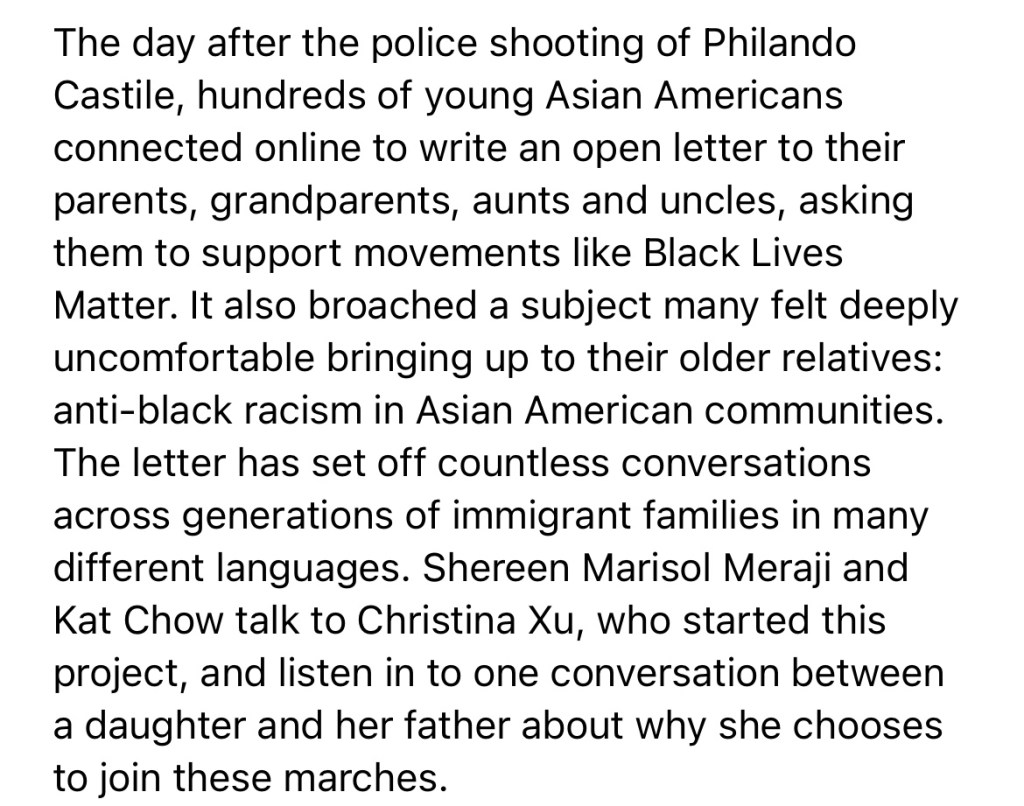 -Episode 7/26/16 A Letter From Young Asian Americans, To Their Parents About Black Lives Matter https://podcasts.apple.com/us/podcast/code-switch/id1112190608?i=1000373164987