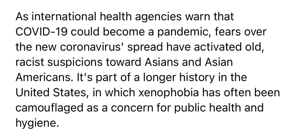 -Episode 3/3/20 When Fear of the Coronavirus Turns into Racism and Xenophobia https://podcasts.apple.com/us/podcast/code-switch/id1112190608?i=1000467407698